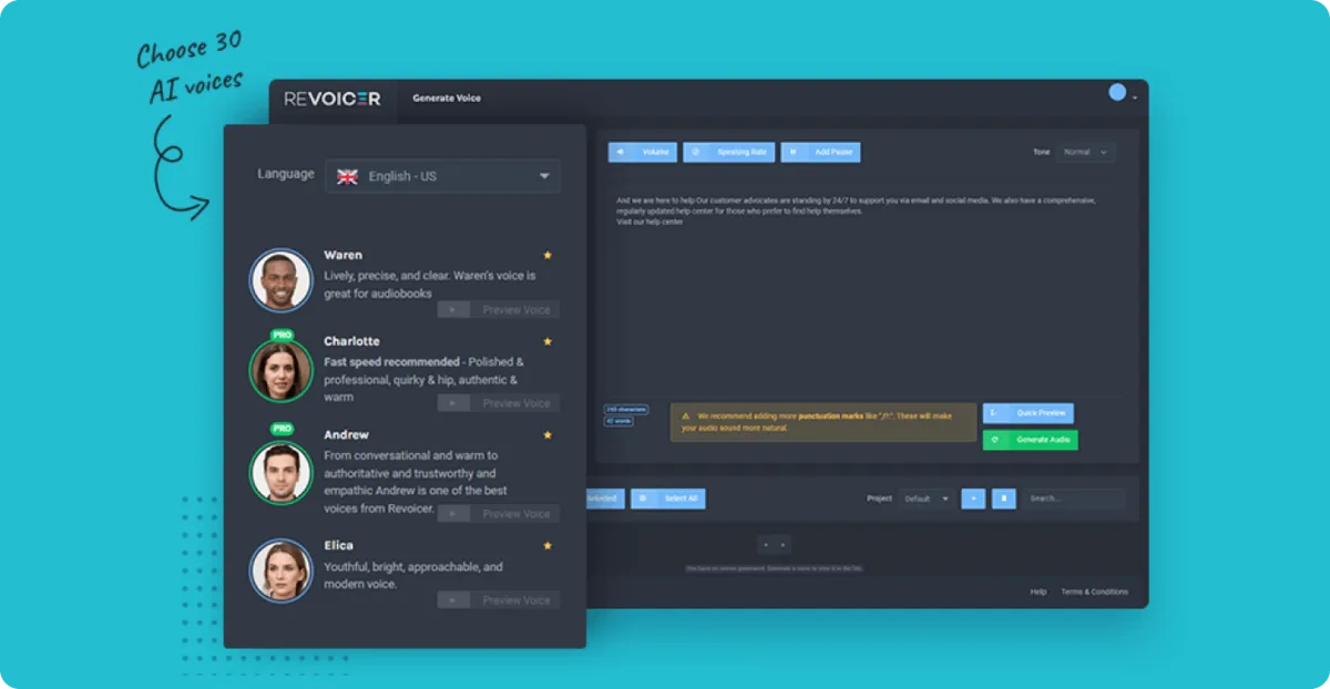 Once your script is ready to go, you need an AI voice generator to bring it to life. If you haven’t found an AI video voice over tool yet, it’s time to start browsing for options. Revoicer is one of the best AI voice generators out there because it offers everything you need, all wrapped up in a user-friendly web-based app. Plus, it will generate your audio in just a few seconds and allow you to customize the AI voice however you need.