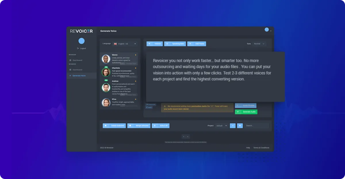 Transform your ideas into engaging content with Revoicer’s most realistic voice generator.